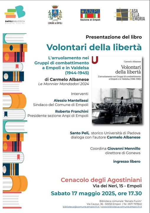 Siamo molto felici ed emozionati, tra pochi giorni potremmo presentarvi il libro a cui teniamo particolarmente e su cui abbiamo investito tempo e risorse: “Volontari della libertà”, di Carmelo Albanese, ed. Le Monnier Università. Il libro è nato dal lavoro di ricerca del Prof. Carmelo Albanese sulla storia dei 530 giovani che partirono da Empoli per liberare il Nord Italia, su cui la storiografia non aveva ancora fatto piena luce.