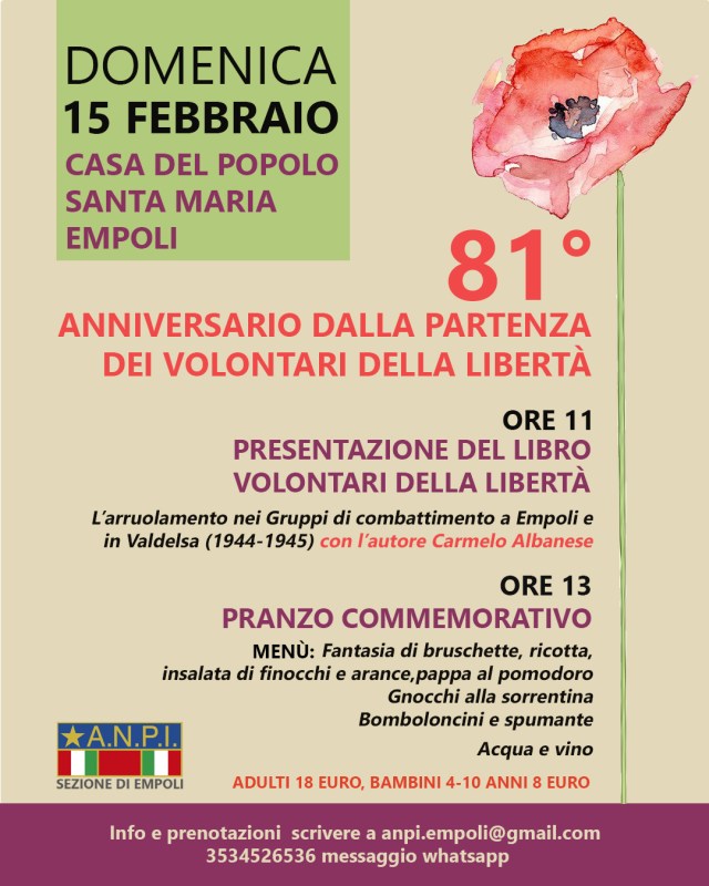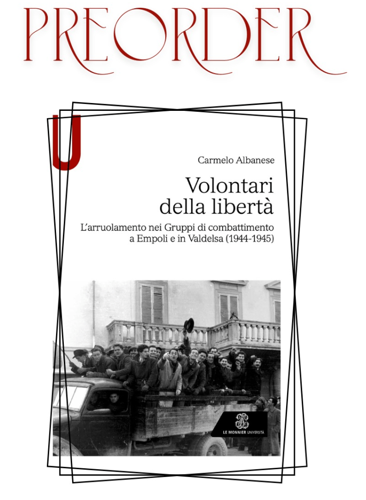 Siamo molto felici di annunciare che tra pochi giorni uscirà un libro a cui teniamo particolarmente: “Volontari della libertà”, di Carmelo Albanese, ed. Le Monnier Università. Il libro è nato dal lavoro di ricerca del Prof. Albanese sulla storia dei 530 giovani che partirono da Empoli per liberare il Nord Italia, su cui la storiografia non aveva ancora fatto piena luce. Il lavoro di ricerca è stato finanziato dal Comune di Empoli ; la pubblicazione è patrocinata dal Comune di Empoli, e realizzata con il contributo della Direzione generale Educazione, ricerca ed istituti culturali, e dall’Associazione Nazionale Partigiani d’Italia-sezione di Empoli.