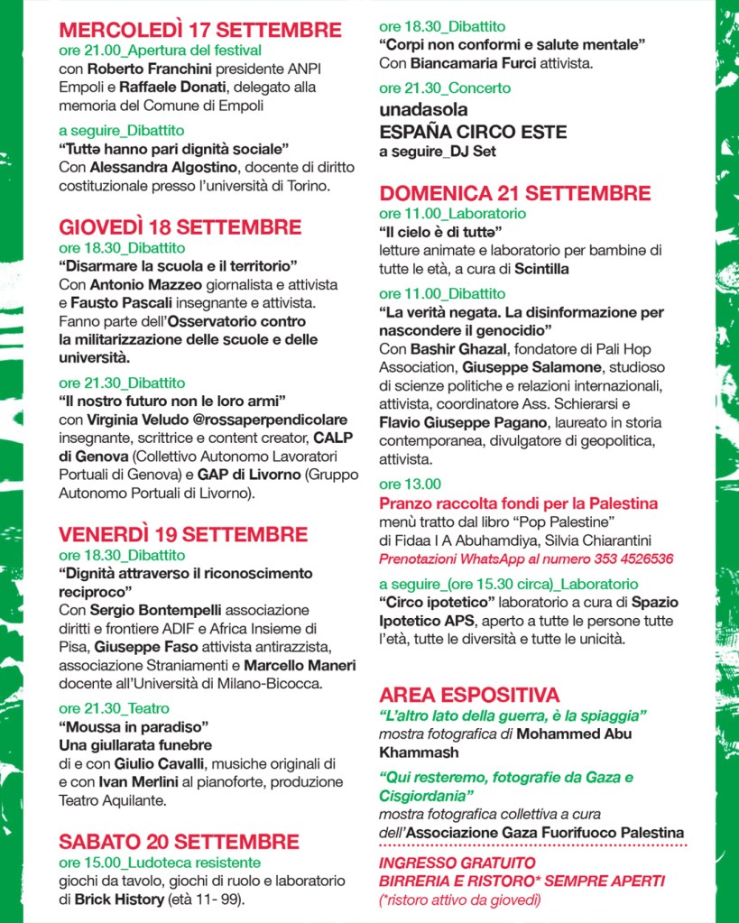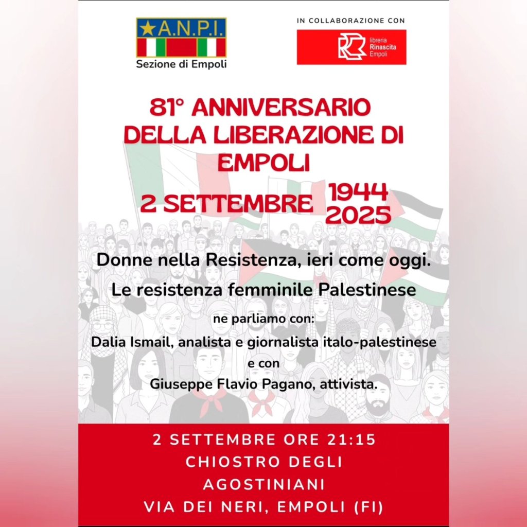 In occasione dell’ 81° Anniversario della Liberazione di Empoli, Martedì 2 Settembre, presso il Chiostro degli Agostoniani alle 21:15, parleremo di Resistenza femminile, focalizzandoci su quella attuale palestinese.